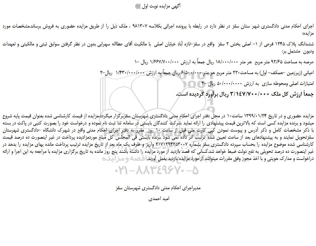 مزایده حضوری و در تاریخ 1399/01/24 ساعت10 در محل دفتر اجرای احکام مدنی دادگستری شهرستان سقزبرگزار میگردد،مزایده از قیمت کارشناسی شده بعنوان قیمت پایه شروع میشود و برنده مزایده کسی است که بالاترین قیمت پیشنهادی را ارائه نماید .شرکت کنندگان بایستی در سامانه ثنا ثبت نام نموده و درخواست خود را بصورت کتبی در پاکت در بسته با ذکر مشخصات کامل و ذکر آدرس و پیوست نمودن کپی کارت ملی قبل از ساعت 10 روز  مقرر به دفتر اجرای احکام مدنی واقع در شهرک دانشگاه -دادگستری شهرستان سقزتحویل نمایند و به پیشنهادهای بعد از ساعت تعیین شده ترتیب اثر داده نمی شود .برنده بایستی فی المجلس کل مبلغ موردمزادیده پرداخت در غیر اینصورت ده درصد قیمت کارشناسی شده موضوع مزایده را بحساب سپرده دادگستری سقز بشماره 2171294253007 واریز و ظرف یک ماه بعد از تاریخ مزایده ترتیب پرداخت مانده بهای مزایده را بدهد در غیر اینصورت ده درصد تحویلی به نفع دولت ضبط خواهد شد.کسانی که قصد بازدید از مورد مزایده را داشته باشند پنج روز مانده به تاریخ برگزاری مزایده با مراجعه به این اجرا و ارائه دراخواست و مدارک هویتی و با اخذ مجوز وفق مقررات میتوانند از مورد مزایده بازدید بعمل آورند.