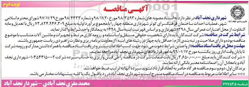 شهرداری نجف آباد در نظر دارد به استناد مصوبه های شماره 98/3593 مورخ 98.11.20 و شماره 98/4433 مورخ 97.11.29 شورای محترم اسلامی شهر عملیات احداث ساختمان فرهنگسرای کوثر شهرداری منطقه چهار را با مجموع برآورد اولیه به مبلغ 72.824.946.309 ریال با تعدیل و مابه التفاوت از محل اعتبارات عمرانی سال 1398 شهرداری و براساس فهرست ابنیه سال 1398 پیمانکار واجد شرایط واگذار نماید.