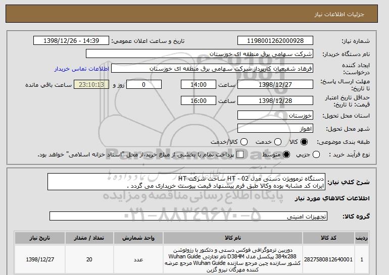 شرح کلی نیاز: دستگاه ترموویژن دستی مدل HT - 02 ساخت شرکت HT