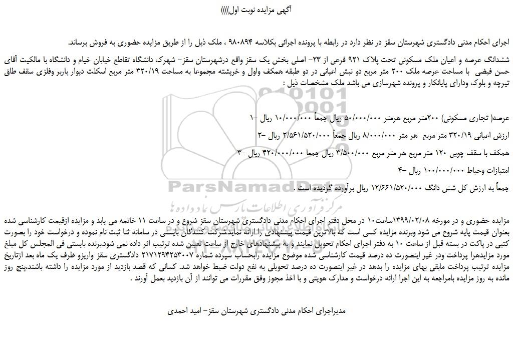 اجرای احکام مدنی دادگستری شهرستان سقز در نظر دارد در رابطه با پرونده اجرائی بکلاسه 980894 ، ملک ذیل را از طریق مزایده حضوری به فروش برساند.