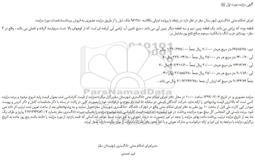 مزایده حضوری و در تاریخ 1399/02/07 ساعت 10:00 در محل دفتر اجرای احکام مدنی دادگستری شهرستان سقزبرگزار میگردد،مزایده از قیمت کارشناسی شده بعنوان قیمت پایه شروع میشود و برنده مزایده کسی است که بالاترین قیمت پیشنهادی را ارائه نماید .شرکت کنندگان بایستی در سامانه ثنا ثبت نام نموده و درخواست خود را بصورت کتبی در پاکت در بسته با ذکر مشخصات کامل و ذکر آدرس و پیوست نمودن کپی کارت ملی قبل از ساعت 10 روز مقرر به دفتر اجرای احکام مدنی واقع در شهرک دانشگاه -دادگستری شهرستان سقزتحویل نمایند و به پیشنهادهای بعد از ساعت تعیین شده ترتیب اثر داده نمی شود .برنده بایستی فی المجلس کل مبلغ مورد مزادیده پرداخت در غیر اینصورت ده درصد قیمت کارشناسی شده موضوع مزایده را بحساب سپرده دادگستری سقز بشماره 2171294253007 واریز و ظرف یک ماه بعد از تاریخ مزایده ترتیب پرداخت مانده بهای مزایده را بدهد در غیر اینصورت ده درصد تحویلی به نفع دولت ضبط خواهد شد.کسانی که قصد بازدید از مورد مزایده را داشته باشند پنج روز مانده به تاریخ برگزاری مزایده با مراجعه به این اجرا و ارائه دراخواست و مدارک هویتی و با اخذ مجوز وفق مقررات میتوانند از مورد مزایده بازدید بعمل آورند.
