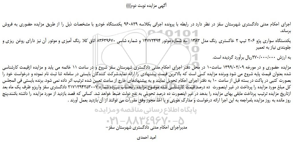 اجرای احکام مدنی دادگستری شهرستان سقز در نظر دارد در رابطه با پرونده اجرائی بکلاسه 960829 یکدستگاه خودرو با مشخصات ذیل را از طریق مزایده حضوری به فروش برساند.