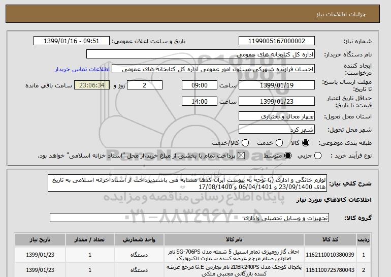 استعلام لوازم خانگی و اداری (با توجه به پیوست ایران کدها مشابه می باشندپرداخت از اسناد خزانه اسلامی به تاریخ های 23/09/1400 و 06/04/1401 و 17/08/1400 , استعلام لوازم خانگی و اداری (با توجه به پیوست ایران کدها مشابه می باشندپرداخت از اسناد خزانه اسلامی به تاریخ های 23/09/1400 و 06/04/1401 و 17/08/1400