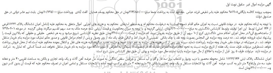 مزایده، مزایده فروش اعیان ششدانگ پلاک 11222فرعی از 146 اصلی