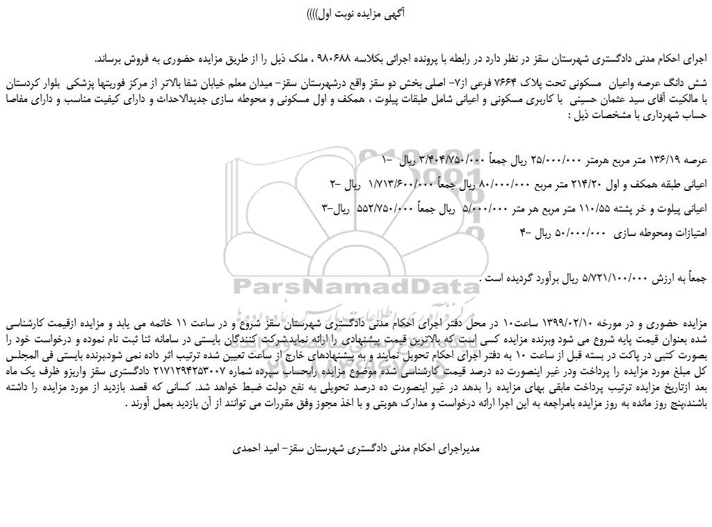 اجرای احکام مدنی دادگستری شهرستان سقز در نظر دارد در رابطه با پرونده اجرائی بکلاسه 980688 ، ملک ذیل را از طریق مزایده حضوری به فروش برساند.