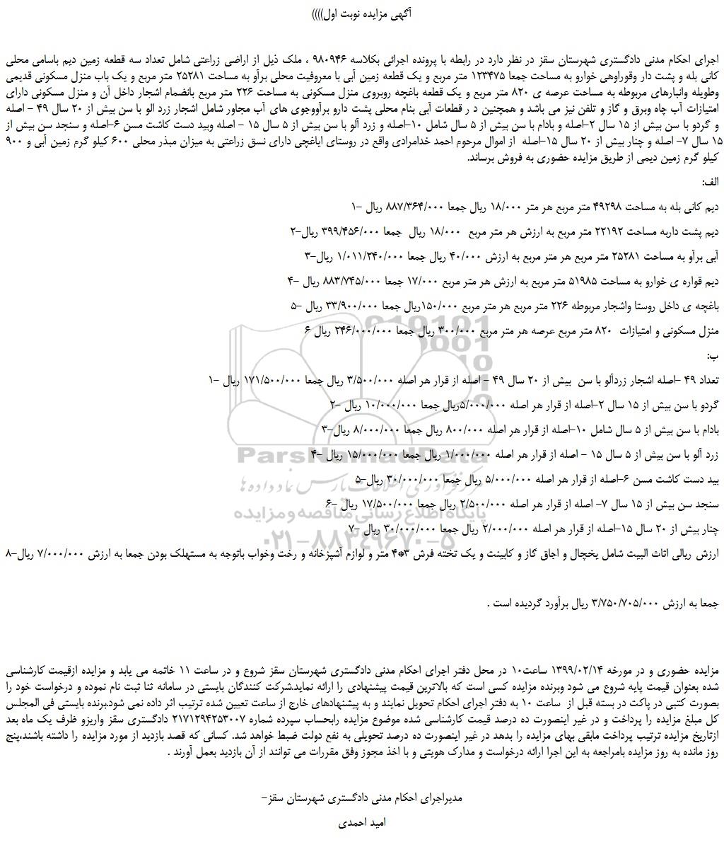 اجرای احکام مدنی دادگستری شهرستان سقز در نظر دارد در رابطه با پرونده اجرائی بکلاسه 980946 ، ملک ذیل از اراضی زراعتی شامل تعداد سه قطعه زمین دیم باسامی محلی کانی بله و پشت دار وقوراوهی خوارو به مساحت جمعا 123475 متر مربع و یک قطعه زمین آبی با معروفیت محلی برآو به مساحت 25281 متر مربع و یک باب منزل مسکونی قدیمی وطویله وانبارهای مربوطه به مساحت عرصه ی 820 متر مربع و یک قطعه باغچه روبروی منزل مسکونی به مساحت 226 متر مربع بانضمام اشجار داخل آن و منزل مسکونی دارای امتیازات آب چاه وبرق و گاز و تلفن نیز می باشد و همچنین د ر قطعات آبی بنام محلی پشت دارو برآووجوی های آب مجاور شامل اشجار زرد الو با سن بیش از 20 سال 49 - اصله و گردو با سن بیش از 15 سال 2-اصله و بادام با سن بیش از 5 سال شامل 10-اصله و زرد آلو با سن بیش از 5 سال 15 - اصله وبید دست کاشت مسن 6-اصله و سنجد سن بیش از 15 سال 7- اصله و چنار بیش از 20 سال 15-اصله از اموال مرحوم احمد خدامرادی واقع در روستای ایاغچی دارای نسق زراعتی به میزان مبذر محلی 600 کیلو گرم زمین آبی و 900 کیلو گرم زمین دیمی از طریق مزایده حضوری به فروش برساند.