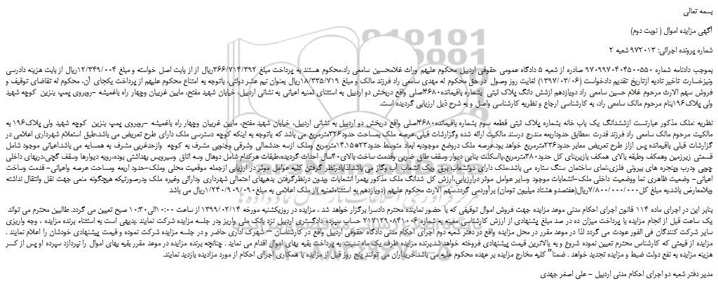 شعبه صادر کننده:شعبه دوم اجرای احکام مدنی دادگستری شهرستان اردبیل/قدیم