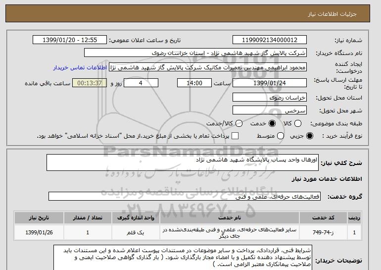 نام دستگاه خریدار:شرکت پالایش گاز شهید هاشمی نژاد - استان خراسان رضوی