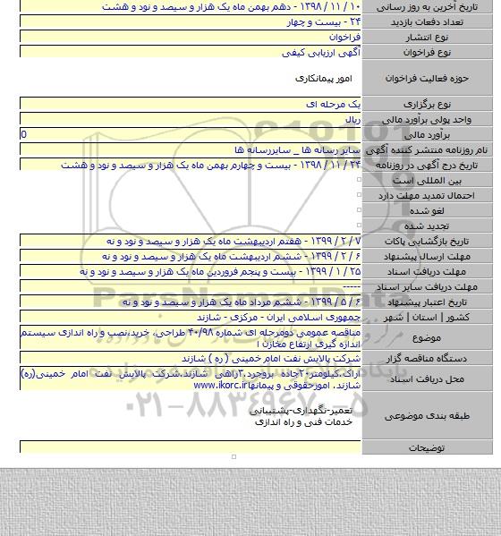 مناقصه عمومی دومرحله ای شماره ۴۰/۹۸ طراحی، خرید،نصب و راه اندازی سیستم اندازه گیری ارتفاع مخازن ا