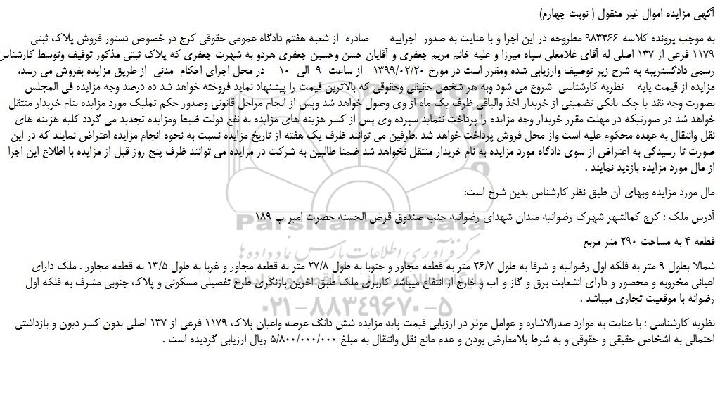 به موجب پرونده کلاسه 983366 مطروحه در این اجرا و با عنایت به صدور  اجراییه      صادره  از شعبه هفتم دادگاه عمومی حقوقی کرج در خصوص دستور فروش پلاک ثبتی 1179 فرعی از 137 اصلی له آقای غلامعلی سپاه میرزا و علیه خانم مریم جعفری و آقایان حسن وحسین جعفری هردو به شهرت جعفری که پلاک ثبتی مذکور توقیف وتوسط کارشناس رسمی دادگستریبه به شرح زیر توصیف وارزیابی شده ومقرر است در مورخ 1399/02/20   از ساعت  9  الی  10    در محل اجرای احکام  مدنی  از طریق مزایده بفروش می رسد، مزایده از قیمت پایه    نظریه کارشناسی  شروع می شود وبه هر شخص حقیقی وحقوقی که بالاترین قیمت را پیشنهاد نماید فروخته خواهد شد ده درصد وجه مزایده فی المجلس بصورت وجه نقد یا چک بانکی تضمینی از خریدار اخذ والباقی ظرف یک ماه از وی وصول خواهد شد وپس از انجام مراحل قانونی وصدور حکم تملیک مورد مزایده بنام خریدار منتقل خواهد شد در صورتیکه در مهلت مقرر خریدار وجه مزایده را پرداخت ننماید سپرده وی پس از کسر هزینه های مزایده به نفع دولت ضبط ومزایده تجدید می گردد کلیه هزینه های نقل وانتقال به عهده محکوم علیه است واز محل فروش پرداخت خواهد شد .طرفین می توانند ظرف یک هفته از تاریخ مزایده نسبت به نحوه انجام مزایده اعتراض نمایند که در این صورت تا رسیدگی به اعتراض از سوی دادگاه مورد مزایده به نام خریدار منتقل نخواهد شد ضمنا طالبین به شرکت در مزایده می توانند ظرف پنج روز قبل از مزایده با اطلاع این اجرا از مال مورد مزایده بازدید نمایند .