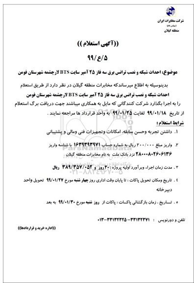 بدین وسیله به اطلاع می رساند که مخابرات منطقه گیلان در نظر دارد از طریق استعلام احداث شبکه و نصب ترانس برق سه فاز 25 آمپر سایت BTS لار چشممه شهرستان فومن را به اجار بگذارد شرکت کنندگانی که مایل به همکاری می باشند جهت دریافت برگ استعلام از تاریخ 99.1.18 لغایت 99.1.25 به واحد قراردادها مراجعه نمایند