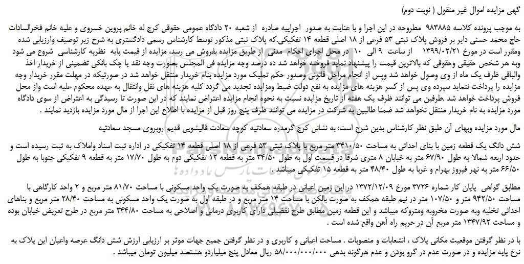 به موجب پرونده کلاسه 983885 مطروحه در این اجرا و با عنایت به صدور اجراییه صادره از شعبه 20 دادگاه عمومی حقوقی کرج له خانم پروین خسروی و علیه خانم فخرالسادات حاج محمد حسنی دایر بر فروش پلاک ثبتی 53 فرعی از 18 اصلی قطعه 14 تفکیکی.که پلاک ثبتی مذکور توسط کارشناس رسمی دادگستری به شرح زیر توصیف وارزیابی شده ومقرر است در مورخ 1399/02/21 از ساعت 9 الی 10 در محل اجرای احکام مدنی از طریق مزایده بفروش می رسد، مزایده از قیمت پایه نظریه کارشناسی شروع می شود وبه هر شخص حقیقی وحقوقی که بالاترین قیمت را پیشنهاد نماید فروخته خواهد شد ده درصد وجه مزایده فی المجلس بصورت وجه نقد یا چک بانکی تضمینی از خریدار اخذ والباقی ظرف یک ماه از وی وصول خواهد شد وپس از انجام مراحل قانونی وصدور حکم تملیک مورد مزایده بنام خریدار منتقل خواهد شد در صورتیکه در مهلت مقرر خریدار وجه مزایده را پرداخت ننماید سپرده وی پس از کسر هزینه های مزایده به نفع دولت ضبط ومزایده تجدید می گردد کلیه هزینه های نقل وانتقال به عهده محکوم علیه است واز محل فروش پرداخت خواهد شد .طرفین می توانند ظرف یک هفته از تاریخ مزایده نسبت به نحوه انجام مزایده اعتراض نمایند که در این صورت تا رسیدگی به اعتراض از سوی دادگاه مورد مزایده به نام خریدار منتقل نخواهد شد ضمنا طالبین به شرکت در مزایده می توانند ظرف پنج روز قبل از مزایده با اطلاع این اجرا از مال مورد مزایده بازدید نمایند .