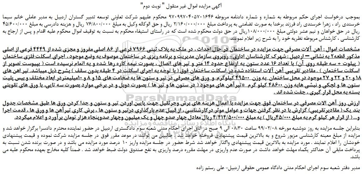 بموجب درخواست اجرای حکم مربوطه به شماره و شماره دادنامه مربوطه 9709970405701646 محکوم علیهم شرکت تعاونی توسعه تدبیر گستران اردبیل به مدیر عاملی خانم سیما خرسندی راد ، زهرا خرسندی راد فرزند برخدا به صورت تضامنی به پرداخت مبلغ 2/160/000/000 ریال و حق الوکاله وکیل به مبلغ 76/800/000 ریال و هزینه دادرسی به مبلغ 45/600/000 ریال در حق خواهان و نیم عشر دولتی مبلغ 108/000/000ریال در حق دولت محکوم شده است که در راستای استیفاء محکوم به نسبت به توقیف اموال محکوم علیه اقدام و پس از ارجاع به کارشناسی ، کارشناس مربوطه نظریه خود را به شرح زیر اعلام نمودند: