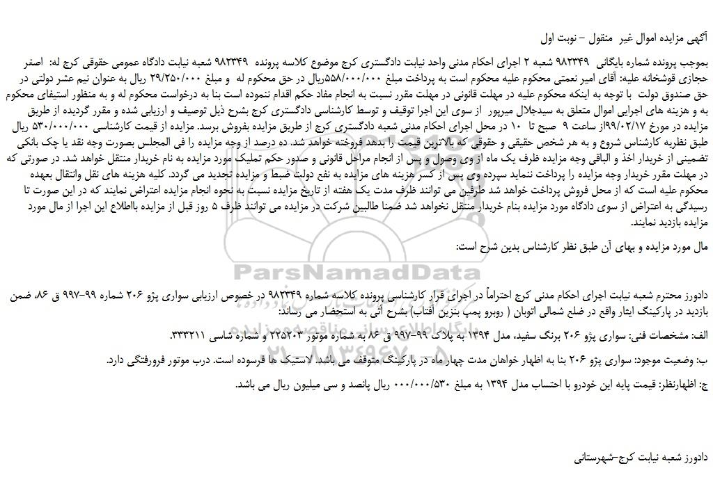 بموجب پرونده شماره بایگانی 982349 شعبه 2 اجرای احکام مدنی واحد نیابت دادگستری کرج موضوع کلاسه پرونده 982349 شعبه نیابت دادگاه عمومی حقوقی کرج له: اصغر حجازی قوشخانه علیه: آقای امیر نعمتی محکوم علیه محکوم است به پرداخت مبلغ 558/000/000ریال در حق محکوم له و مبلغ 29/250/000 ریال به عنوان نیم عشر دولتی در حق صندوق دولت با توجه به اینکه محکوم علیه در مهلت قانونی در مهلت مقرر نسبت به انجام مفاد حکم اقدام ننموده است بنا به درخواست محکوم له و به منظور استیفای محکوم به و هزینه های اجرایی اموال متعلق به سیدجلال میرپور از سوی این اجرا توقیف و توسط کارشناسی دادگستری کرج بشرح ذیل توصیف و ارزیابی شده و مقرر گردیده از طریق مزایده در مورخ 99/02/17از ساعت 9 صبح تا 10 در محل اجرای احکام مدنی شعبه دادگستری کرج از طریق مزایده بفروش برسد. مزایده از قیمت کارشناسی 530/000/000 ریال طبق نظریه کارشناس شروع و به هر شخص حقیقی و حقوقی که بالاترین قیمت را بدهد فروخته خواهد شد. ده درصد از وجه مزایده را فی المجلس بصورت وجه نقد یا چک بانکی تضمینی از خریدار اخذ و الباقی وجه مزایده ظرف یک ماه از وی وصول و پس از انجام مراحل قانونی و صدور حکم تملیک مورد مزایده به نام خریدار منتقل خواهد شد. در صورتی که در مهلت مقرر خریدار وجه مزایده را پرداخت ننماید سپرده وی پس از کسر هزینه های مزایده به نفع دولت ضبط و مزایده تجدید می گردد. کلیه هزینه های نقل وانتقال بعهده محکوم علیه است که از محل فروش پرداخت خواهد شد طرفین می توانند ظرف مدت یک هفته از تاریخ مزایده نسبت به نحوه انجام مزایده اعتراض نمایند که در این صورت تا رسیدگی به اعتراض از سوی دادگاه مورد مزایده بنام خریدار منتقل نخواهد شد ضمنا طالبین شرکت در مزایده می توانند ظرف 5 روز قبل از مزایده بااطلاع این اجرا از مال مورد مزایده بازدید نمایند.