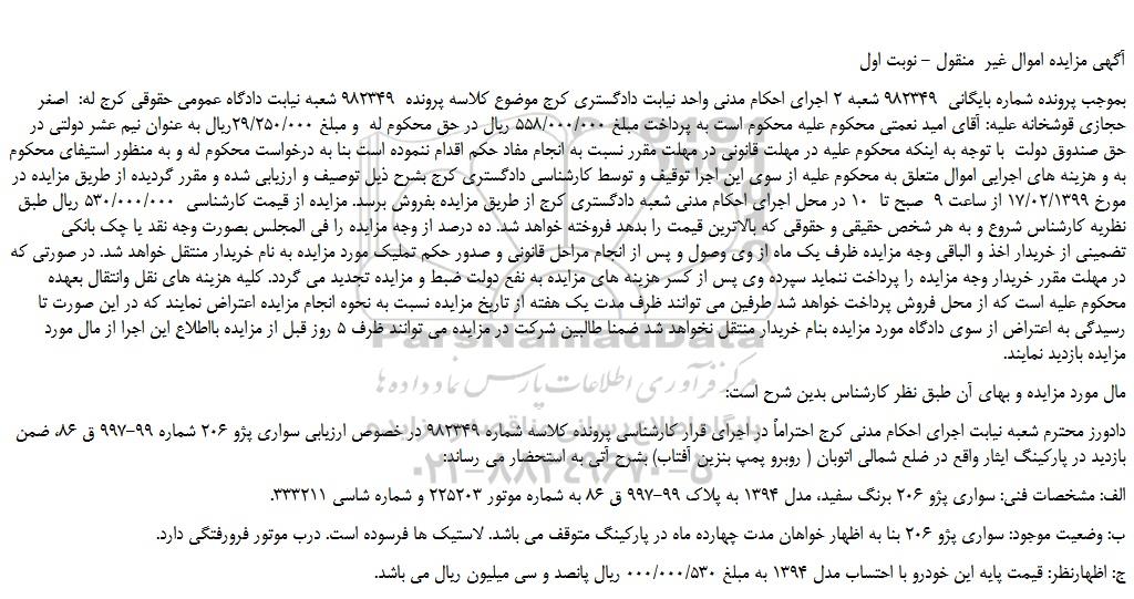 بموجب پرونده شماره بایگانی 982349 شعبه 2 اجرای احکام مدنی واحد نیابت دادگستری کرج موضوع کلاسه پرونده 982349 شعبه نیابت دادگاه عمومی حقوقی کرج له: اصغر حجازی قوشخانه علیه: آقای امید نعمتی محکوم علیه محکوم است به پرداخت مبلغ 558/000/000 ریال در حق محکوم له و مبلغ 29/250/000ریال به عنوان نیم عشر دولتی در حق صندوق دولت با توجه به اینکه محکوم علیه در مهلت قانونی در مهلت مقرر نسبت به انجام مفاد حکم اقدام ننموده است بنا به درخواست محکوم له و به منظور استیفای محکوم به و هزینه های اجرایی اموال متعلق به محکوم علیه از سوی این اجرا توقیف و توسط کارشناسی دادگستری کرج بشرح ذیل توصیف و ارزیابی شده و مقرر گردیده از طریق مزایده در مورخ 17/02/1399 از ساعت 9 صبح تا 10 در محل اجرای احکام مدنی شعبه دادگستری کرج از طریق مزایده بفروش برسد. مزایده از قیمت کارشناسی 530/000/000 ریال طبق نظریه کارشناس شروع و به هر شخص حقیقی و حقوقی که بالاترین قیمت را بدهد فروخته خواهد شد. ده درصد از وجه مزایده را فی المجلس بصورت وجه نقد یا چک بانکی تضمینی از خریدار اخذ و الباقی وجه مزایده ظرف یک ماه از وی وصول و پس از انجام مراحل قانونی و صدور حکم تملیک مورد مزایده به نام خریدار منتقل خواهد شد. در صورتی که در مهلت مقرر خریدار وجه مزایده را پرداخت ننماید سپرده وی پس از کسر هزینه های مزایده به نفع دولت ضبط و مزایده تجدید می گردد. کلیه هزینه های نقل وانتقال بعهده محکوم علیه است که از محل فروش پرداخت خواهد شد طرفین می توانند ظرف مدت یک هفته از تاریخ مزایده نسبت به نحوه انجام مزایده اعتراض نمایند که در این صورت تا رسیدگی به اعتراض از سوی دادگاه مورد مزایده بنام خریدار منتقل نخواهد شد ضمنا طالبین شرکت در مزایده می توانند ظرف 5 روز قبل از مزایده بااطلاع این اجرا از مال مورد مزایده بازدید نمایند.