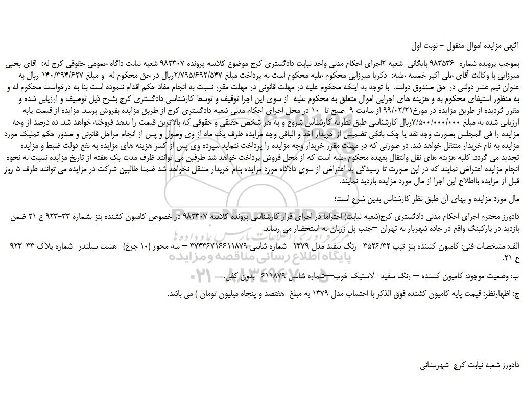 دادورز محترم اجرای احکام مدنی دادگستری کرج(شعبه نیابت) احتراماً در اجرای قرار کارشناسی پرونده کلاسه 982307 در خصوص کامیون کشنده بنز بشماره 33-923 ع 21 ضمن بازدید در پارکینگ واقع در جاده شهریار به تهران –جنب پل زرنان به استحضار می رساند.