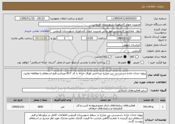 شرح کلی نیاز: پروژه حداث جاده دسترسی بین مزارع -پرداختی اوراق خزانه با کد 817 میباشد.فرم استعلام را مطالعه نمایید.
