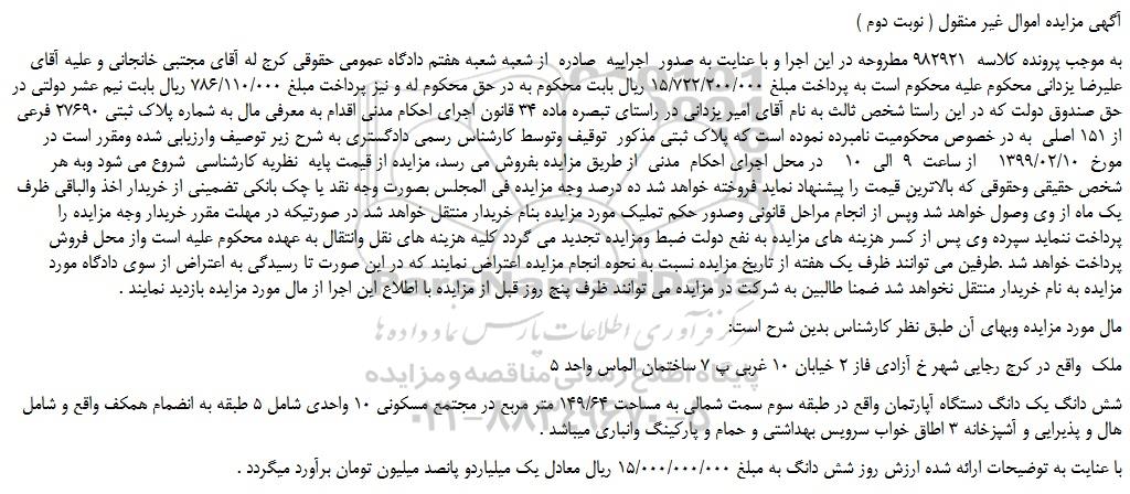 به موجب پرونده کلاسه 982921 مطروحه در این اجرا و با عنایت به صدور اجراییه صادره از شعبه شعبه هفتم دادگاه عمومی حقوقی کرج له آقای مجتبی خانجانی و علیه آقای علیرضا یزدانی محکوم علیه محکوم است به پرداخت مبلغ 15/722/200/000 ریال بابت محکوم به در حق محکوم له و نیز پرداخت مبلغ 786/110/000 ریال بابت نیم عشر دولتی در حق صندوق دولت که در این راستا شخص ثالث به نام آقای امیر یزدانی در راستای تبصره ماده 34 قانون اجرای احکام مدنی اقدام به معرفی مال به شماره پلاک ثبتی 27690 فرعی از 151 اصلی به در خصوص محکومیت نامبرده نموده است که پلاک ثبتی مذکور توقیف وتوسط کارشناس رسمی دادگستری به شرح زیر توصیف وارزیابی شده ومقرر است در مورخ 1399/02/10 از ساعت 9 الی 10 در محل اجرای احکام مدنی از طریق مزایده بفروش می رسد، مزایده از قیمت پایه نظریه کارشناسی شروع می شود وبه هر شخص حقیقی وحقوقی که بالاترین قیمت را پیشنهاد نماید فروخته خواهد شد ده درصد وجه مزایده فی المجلس بصورت وجه نقد یا چک بانکی تضمینی از خریدار اخذ والباقی ظرف یک ماه از وی وصول خواهد شد وپس از انجام مراحل قانونی وصدور حکم تملیک مورد مزایده بنام خریدار منتقل خواهد شد در صورتیکه در مهلت مقرر خریدار وجه مزایده را پرداخت ننماید سپرده وی پس از کسر هزینه های مزایده به نفع دولت ضبط ومزایده تجدید می گردد کلیه هزینه های نقل وانتقال به عهده محکوم علیه است واز محل فروش پرداخت خواهد شد .طرفین می توانند ظرف یک هفته از تاریخ مزایده نسبت به نحوه انجام مزایده اعتراض نمایند که در این صورت تا رسیدگی به اعتراض از سوی دادگاه مورد مزایده به نام خریدار منتقل نخواهد شد ضمنا طالبین به شرکت در مزایده می توانند ظرف پنج روز قبل از مزایده با اطلاع این اجرا از مال مورد مزایده بازدید نمایند .