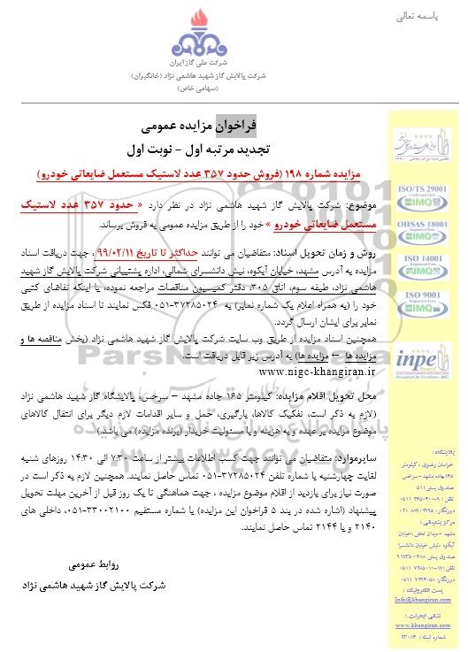 موضوع شرکت پالایش گاز شهید هاشمی نژاد در نظردارد حدود 357 عدد لاستیک مستعمل ضایعاتی خودرو خود را ازطریق مزایده عمومی به فروش برساند