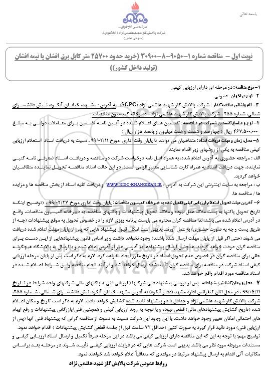 نوبت اول - مناقصه شماره 1- 9050 - 8- 30900 (خرید حدود 25700 متر کابل برق افشان یا نیمه افشان تولید داخل کشور)