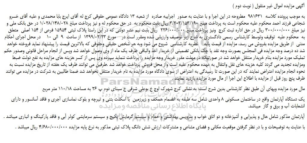 به موجب پرونده کلاسه 981631 مطروحه در این اجرا و با عنایت به صدور اجراییه صادره از شعبه 13 دادگاه عمومی حقوقی کرج له آقای ایرج بابا محمدی و علیه آقای خسرو شجاعی فرزند احمد محکوم علیه محکوم است به پرداخت مبلغ 3/203/153/190 ریال بابت محکوم به در حق محکوم له و نیز پرداخت مبلغ 1/028/148/028 در حق بانک ملی و نیز مبلغ 300/000/000 ریال در حق اداره ثبت کرج ونیز پرداخت مبلغ 226/000/000 ریال بابت نیم عشر دولتی که در این راستا پلاک ثبتی 15954 فرعی از 154 اصلی متعلق به محکوم علیه توقیف وتوسط کارشناس رسمی دادگستری به شرح زیر توصیف وارزیابی شده ومقرر است در مورخ 1399/02/23 از ساعت 9 الی 10 در محل اجرای احکام مدنی از طریق مزایده بفروش می رسد، مزایده از قیمت پایه نظریه کارشناسی شروع می شود وبه هر شخص حقیقی وحقوقی که بالاترین قیمت را پیشنهاد نماید فروخته خواهد شد ده درصد وجه مزایده فی المجلس بصورت وجه نقد یا چک بانکی تضمینی از خریدار اخذ والباقی ظرف یک ماه از وی وصول خواهد شد وپس از انجام مراحل قانونی وصدور حکم تملیک مورد مزایده بنام خریدار منتقل خواهد شد در صورتیکه در مهلت مقرر خریدار وجه مزایده را پرداخت ننماید سپرده وی پس از کسر هزینه های مزایده به نفع دولت ضبط ومزایده تجدید می گردد کلیه هزینه های نقل وانتقال به عهده محکوم علیه است واز محل فروش پرداخت خواهد شد .طرفین می توانند ظرف یک هفته از تاریخ مزایده نسبت به نحوه انجام مزایده اعتراض نمایند که در این صورت تا رسیدگی به اعتراض از سوی دادگاه مورد مزایده به نام خریدار منتقل نخواهد شد ضمنا طالبین به شرکت در مزایده می توانند ظرف پنج روز قبل از مزایده با اطلاع این اجرا از مال مورد مزایده بازدید نمایند .