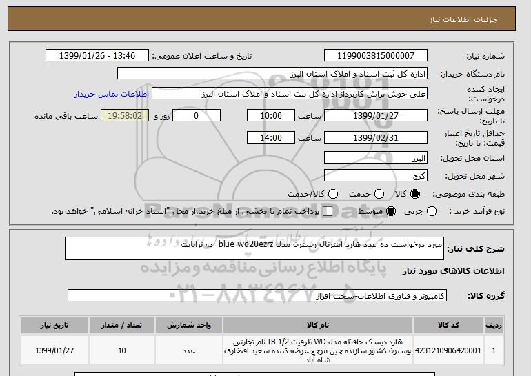 شرح کلی نیاز: مورد درخواست ده عدد هارد اینترنال وسترن مدل blue wd20ezrz دو ترابایت