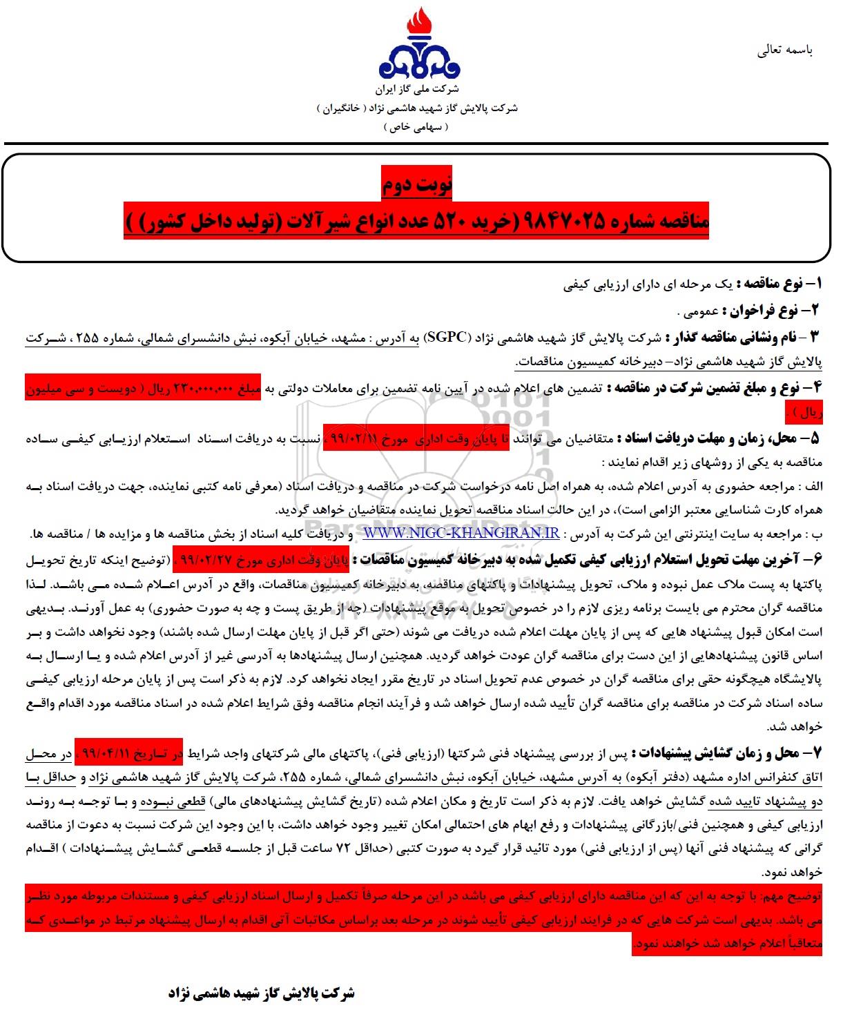 3- نام و نشانی مناقصه گذار: شرکت پالایش گاز شهید هاشمی نژاد (SGPC) به آدرس : مشهد خیابان آبکوه نبش دانشسرای شمالی شماره 255 شرکت پالایش گاز شهید هاشمی نژاد دبیرخانه کمیسیون مناقصات