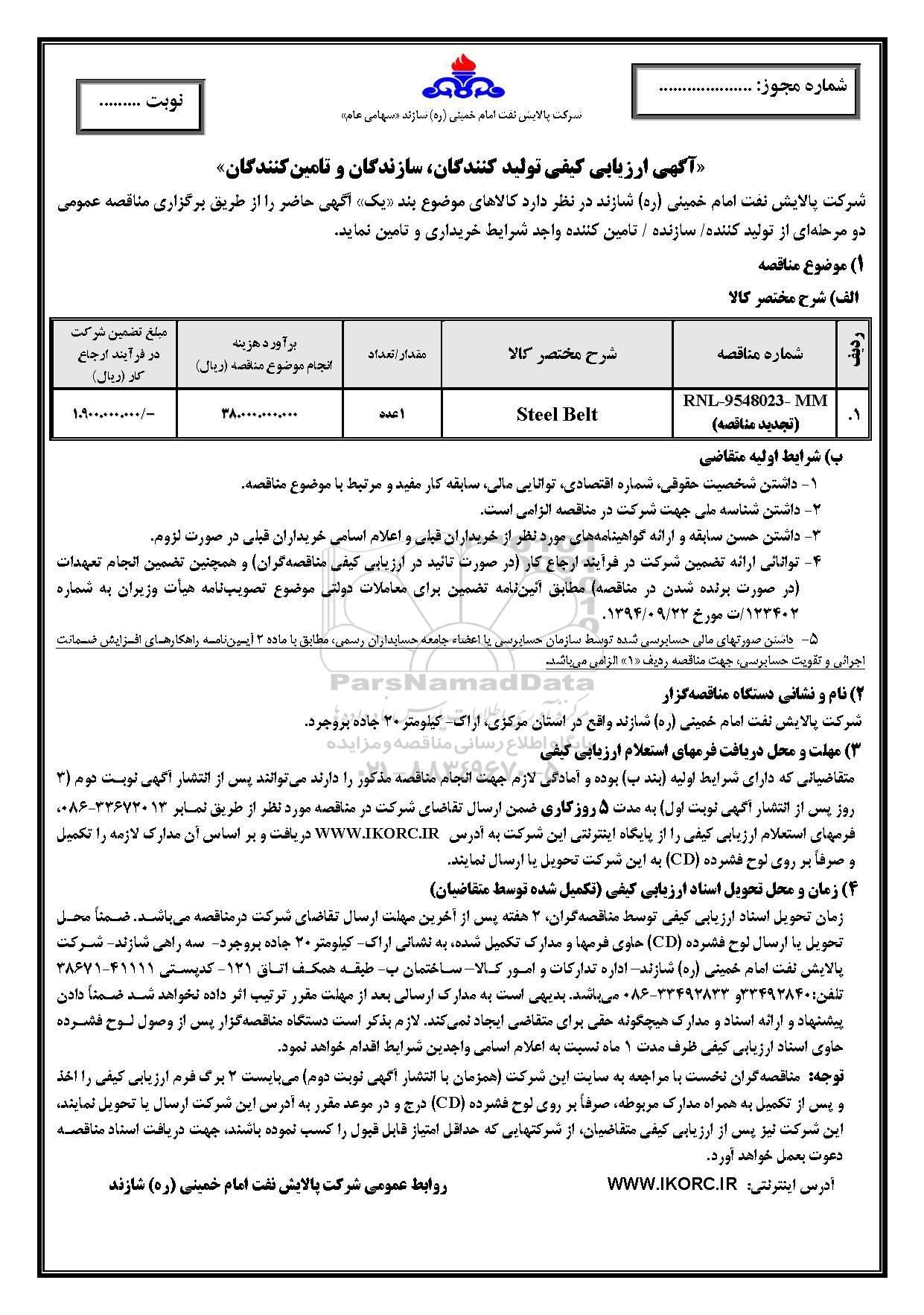 مناقصه خرید steel belt از کلیه افراد متخصص و شرکتها واجد شرایط دعوت به عمل میآید در مناقصه با کد خبرگزاری پارس نماد: 2339849 شرکت نمایند.