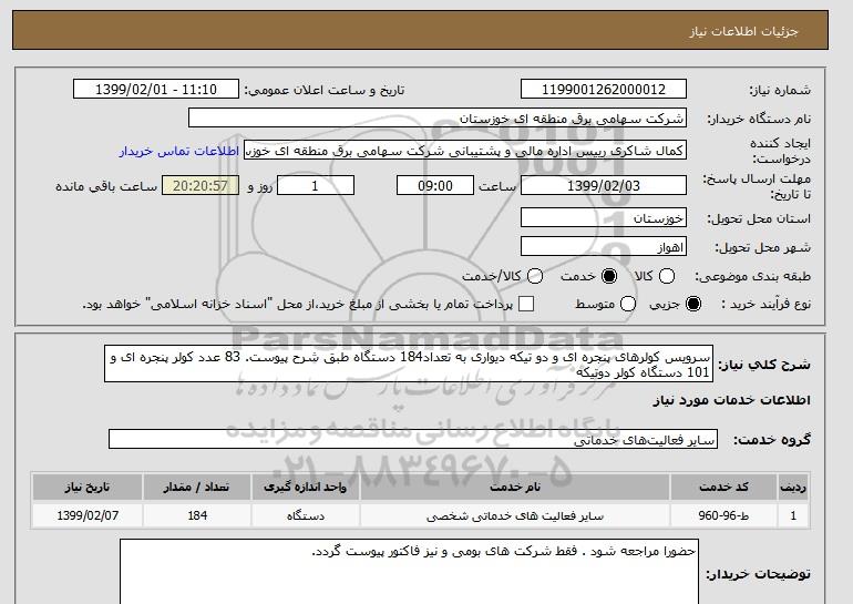 شرح کلی نیاز: سرویس کولرهای پنجره ای و دو تیکه دیواری به تعداد184 دستگاه طبق شرح پیوست. 83 عدد کولر پنجره ای و 101 دستگاه کولر دوتیکه