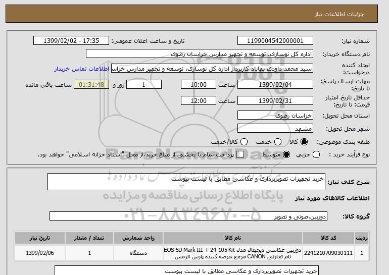 توضیحات خریدارخرید تجهیزات تصویربرداری و عکاسی مطابق با لیست پیوست