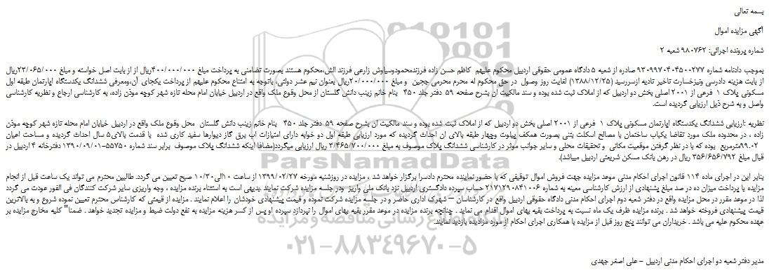بموجب دادنامه شماره 9309970404500277 صادره از شعبه 5 دادگاه عمومی حقوقی اردبیل محکوم علیهم کاظم حسن زاده فرزندمحمودوسیاوش زارعی فرزند الش،محکوم هستند بصورت تضامنی به پرداخت مبلغ 400/000/000ریال از از بابت اصل خواسته و مبلغ 23/065/000ریال از بابت هزینه دادرسی ونیزخسارت تاخیر تادیه ازسررسید (1388/12/25) لغایت روز وصول در حق محکوم له محرم محرمی ججین و مبلغ 20/000/000ریال بعنوان نیم عشر دولتی، باتوجه به امتناع محکوم علیهم از پرداخت یکجای آن،ومعرفی ششدانگ یکدستگاه اپارتمان طبقه اول مسکونی پلاک 1 فرعی از 2001 اصلی بخش دو اردبیل که از املاک ثبت شده بوده و سند مالکیت ان بشرح صفحه 59 دفتر جلد 450 بنام خانم زینب دانش گلستان از محل وقوع ملک واقع در اردبیل خیابان امام محله تازه شهر کوچه موذن زاده، به کارشناسی ارجاع و نظریه کارشناسی واصل و به شرح ذیل ارزیابی گردیده است.