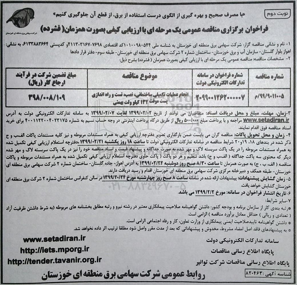 | 99/9011005/م | 2099001262000007 | انجام عملیات تکمیلی ساختمانی، نصب، تست و راه اندازی پست موقت 132 کیلوولت بهمئی |