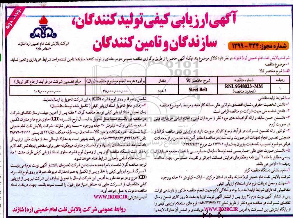ارزیابی کیفی خرید steel belt تجدید - نوبت دوم از کلیه افراد متخصص و شرکتها واجد شرایط دعوت به عمل میآید در مناقصه با کد خبرگزاری پارس نماد: 2349078 شرکت نمایند.