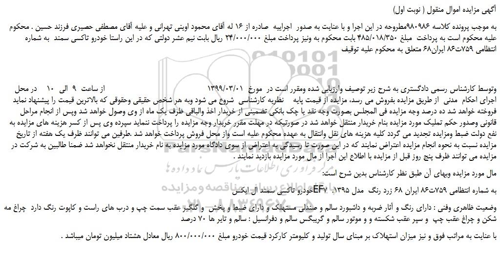 به موجب پرونده کلاسه 980986مطروحه در این اجرا و با عنایت به صدور  اجراییه  صادره از 16 له آقای محمود اوینی تهرانی و علیه آقای مصطفی حصیری فرزند حسین . محکوم علیه محکوم است به پرداخت  مبلغ 485/018/350 بابت محکوم به ونیز پرداخت مبلغ 24/000/000 ریال بابت نیم عشر دولتی که در این راستا خودرو تاکسی سمند  به شماره انتظامی 759ت86 ایران68 متعلق به محکوم علیه توقیف