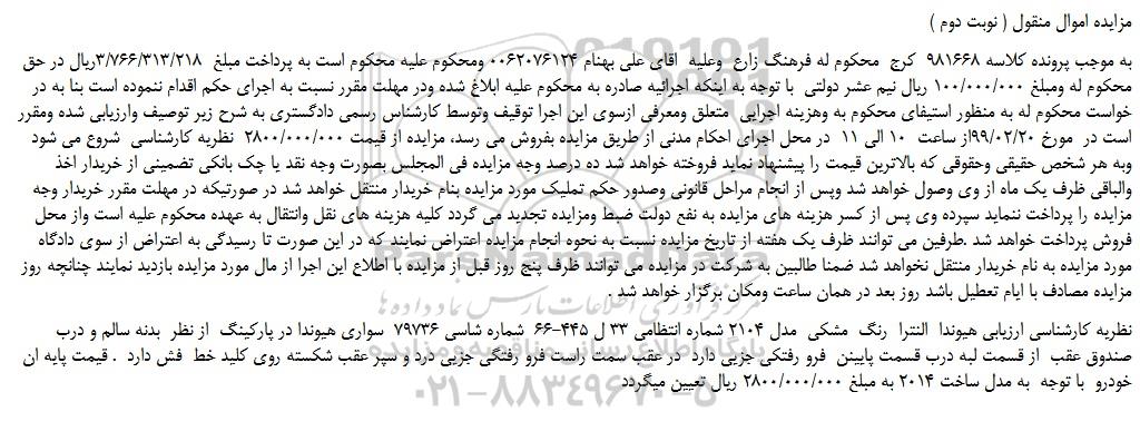 به موجب پرونده کلاسه 981668 کرج محکوم له فرهنگ زارع وعلیه اقای علی بهنام 0062076124 ومحکوم علیه محکوم است به پرداخت مبلغ 3/766/313/218ریال در حق محکوم له ومبلغ 100/000/000 ریال نیم عشر دولتی با توجه به اینکه اجرائیه صادره به محکوم علیه ابلاغ شده ودر مهلت مقرر نسبت به اجرای حکم اقدام ننموده است بنا به در خواست محکوم له به منظور استیفای محکوم به وهزینه اجرایی متعلق ومعرفی ازسوی این اجرا توقیف وتوسط کارشناس رسمی دادگستری به شرح زیر توصیف وارزیابی شده ومقرر است در مورخ 99/02/20از ساعت 10 الی 11 در محل اجرای احکام مدنی از طریق مزایده بفروش می رسد، مزایده از قیمت 2800/000/000 نظریه کارشناسی شروع می شود وبه هر شخص حقیقی وحقوقی که بالاترین قیمت را پیشنهاد نماید فروخته خواهد شد ده درصد وجه مزایده فی المجلس بصورت وجه نقد یا چک بانکی تضمینی از خریدار اخذ والباقی ظرف یک ماه از وی وصول خواهد شد وپس از انجام مراحل قانونی وصدور حکم تملیک مورد مزایده بنام خریدار منتقل خواهد شد در صورتیکه در مهلت مقرر خریدار وجه مزایده را پرداخت ننماید سپرده وی پس از کسر هزینه های مزایده به نفع دولت ضبط ومزایده تجدید می گردد کلیه هزینه های نقل وانتقال به عهده محکوم علیه است واز محل فروش پرداخت خواهد شد .طرفین می توانند ظرف یک هفته از تاریخ مزایده نسبت به نحوه انجام مزایده اعتراض نمایند که در این صورت تا رسیدگی به اعتراض از سوی دادگاه مورد مزایده به نام خریدار منتقل نخواهد شد ضمنا طالبین به شرکت در مزایده می توانند ظرف پنج روز قبل از مزایده با اطلاع این اجرا از مال مورد مزایده بازدید نمایند چنانچه روز مزایده مصادف با ایام تعطیل باشد روز بعد در همان ساعت ومکان برگزار خواهد شد .