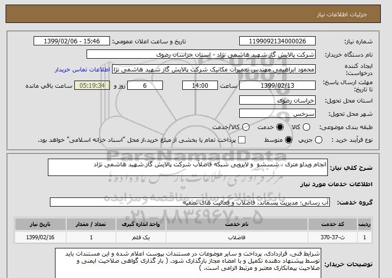 شرح کلی نیاز: انجام ویدئو متری ، شسشو و لایروبی شبکه فاضلآب شرکت پالایش گاز شهید هاشمی نژاد