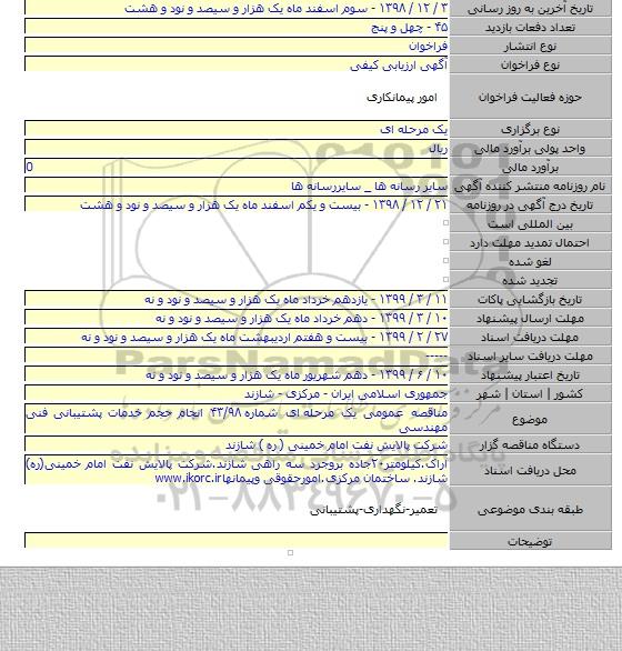 مناقصه عمومی یک مرحله ای شماره ۴۳/۹۸ انجام حجم خدمات پشتیبانی فنی مهندسی