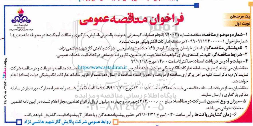1- شماره و موضوع مناقصه: مناقصه شماره 990021 (انجام عملیات کیسه زنی بنتونیت پالت زنی، انبارش، بارگیری و نظافت آبجکت ها در محوطه دانه بندی) با شماره فراخوان 2099092134000001 در سامانه تدارکات الکترونیکی دولت (ستاد)