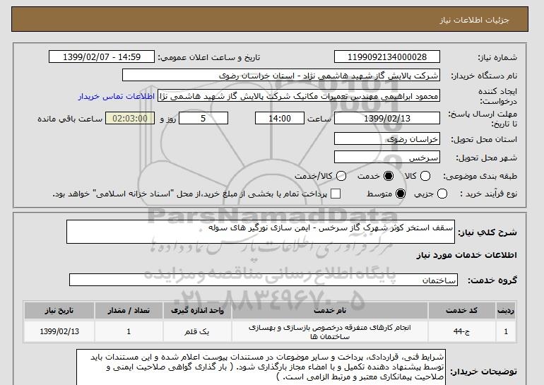 شرح کلی نیاز: سقف استخر کوثر شهرک گاز سرخس - ایمن سازی نورگیر های سوله