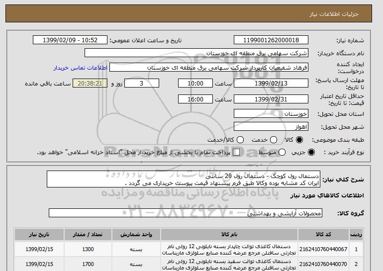 شرح کلی نیاز: دستمال رول کوچک - دستمال رول 20 سانتی