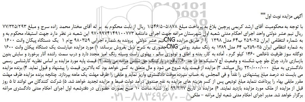 با توجه به محکومیت آقای ارشد کریمی پرچین بلاغ به پرداخت مبلغ 1/546/505/878 ریال از بابت محکوم به بر له آقای مختار محمد زاده سرج و مبلغ 77/325/293 ریال نیم عشر دولتی واحد اجرای احکام مدنی شعبه اول شهرستان مراغه جهت اجرای دادنامه 9709974149100773 این شعبه در نظر دارد جهت استیفاء محکوم به و نیم عشر دولتی پرونده به شماره اجرایی 980359 ج/م 1 یک دستگاه پیکان وانت 1600 CNG به شماره انتظامی ایران 25-259 ب64 مدل 1398 را از طریق مزایده حضوری به شرح ذیل بفروش برساند: 1) مورد مزایده عبارتست یک دستگاه پیکان وانت 1600 CNG به شماره انتظامی ایران 25-259ب 64 مدل 1389 به رنگ سفید روغنی دوگانه سوز ظرفیت ناخالص 1460 کیلو گرم ، آماده به کار، بدنه و اطاق و تودوزی سالم ، پهلوی راست وسیله رنگ امیز مجدد دارد و درب سمت راننده آثار برخورد و سایش بدون بازسازی دارد، چراغ جلو چپ شکسته و وضعیت آج لاستیک ها در حد 60% واقع در پارکینگ حق شناس مراغه می باشد. 2) قیمت پایه مورد مزایده بر اساس نظریه کارشناسی رسمی دادگستری به مبلغ 220/000/000 ریال میباشد. 3) مزایده از قیمت پایه شروع می شود و مال متعلق به کسی خواهد بود که بالاترین قیمت را پیشنهاد و قبول نماید. 4) برنده مزایده می بایست ده درصد مبلغ پیشنهادی را نقداً و فی المجلس به حساب سپرده موقت دادگستری واریز نماید و مابقی را ظرف مهلت یک ماهه بپردازد. چنانچه برنده مزایده ظرف مهلت مقرر مابقی بهاء را پرداخت ننماید مبلغ تودیعی پس از کسر هزینه های مزایده به نفع صندوق درآمد دولت ضبط و مزایده تجدید خواهد شد. 5) شرکت کنندگان می توانند تا 5 روز قبل از مزایده از ملک مورد مزایده بازدید نمایند. 6) مزایده در تاریخ 99/2/27 روز شنبه ساعت 10 صبح بصورت حضوری در دفترشعبه اول اجرای احکام مدنی دادگستری مراغه برگزار خواهد شد. مدیر اجرای احکام مدنی شعبه اول مراغه - ملکی