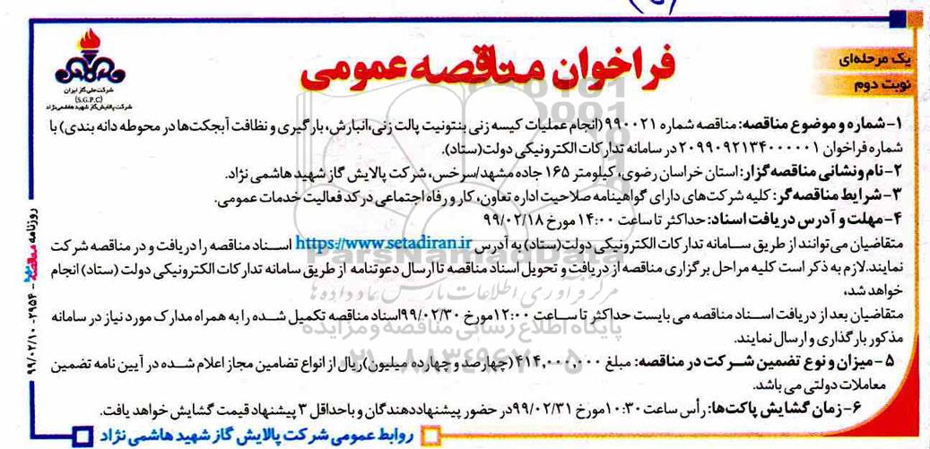1- شماره و موضوع مناقصه: مناقصه شماره 990021 (انجام عملیات کیسه زنی بنتونیت پالت زنی، انبارش، بارگیری و نظافت آبجکت ها در محوطه دانه بندی) با شماره فراخوان 2099092134000001 در سامانه تدارکات الکترونیکی دولت (ستاد)