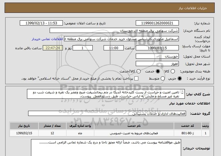 شرح کلی نیاز: تامین امنیت و حراست از پست کلیدخانه اندیکا در چم ریحانشیفت صبح وعصر یک نفره و شیفت شب دو نفره غیر مسلح و ملبس به لباس حراست، طبق دستورالعمل پیوست.