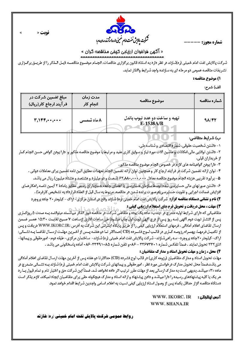 شرکت پالایش نفت امام خمینی (ره) شازند در نظر دارد به استناد قانون برگزاری مناقصات انجام خدمات ذیل را از طریق مناقصه عمومی یک مرحله ای به پیمانکار واجد شرایط واگذار نماید.