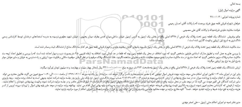ارزش ششدانگ یک قطعه زمین تحت پلاک یک فرعی از 5478 اصلی واقع در بخش یک اردبیل به ماسحت 294 متر مربع به مبلغ 44/100/000/000 ریال (معادل چهار میلیارد و چهارصد و ده میلیون تومان )برآورد میگردد.