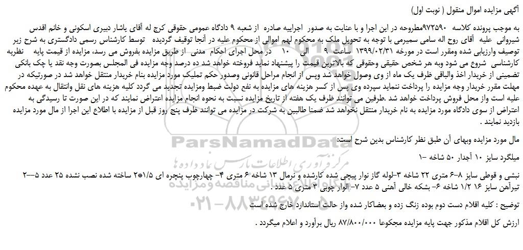به موجب پرونده کلاسه 972590مطروحه در این اجرا و با عنایت به صدور اجراییه صادره از شعبه 9 دادگاه عمومی حقوقی کرج له آقای یاشار دبیری اسکونی و خانم اقدس شیروانی علیه آقای روح اله سامی سمیرمی با توجه به تحویل ملک به محکوم لهم اموالی از محکوم علیه در آنجا توقیف گردیده توسط کارشناس رسمی دادگستری به شرح زیر توصیف وارزیابی شده ومقرر است در مورخه 1399/02/31 ساعت 9 الی 10 در محل اجرای احکام مدنی از طریق مزایده بفروش می رسد، مزایده از قیمت پایه نظریه کارشناسی شروع می شود وبه هر شخص حقیقی وحقوقی که بالاترین قیمت را پیشنهاد نماید فروخته خواهد شد ده درصد وجه مزایده فی المجلس بصورت وجه نقد یا چک بانکی تضمینی از خریدار اخذ والباقی ظرف یک ماه از وی وصول خواهد شد وپس از انجام مراحل قانونی وصدور حکم تملیک مورد مزایده بنام خریدار منتقل خواهد شد در صورتیکه در مهلت مقرر خریدار وجه مزایده را پرداخت ننماید سپرده وی پس از کسر هزینه های مزایده به نفع دولت ضبط ومزایده تجدید می گردد کلیه هزینه های نقل وانتقال به عهده محکوم علیه است واز محل فروش پرداخت خواهد شد .طرفین می توانند ظرف یک هفته از تاریخ مزایده نسبت به نحوه انجام مزایده اعتراض نمایند که در این صورت تا رسیدگی به اعتراض از سوی دادگاه مورد مزایده به نام خریدار منتقل نخواهد شد ضمنا طالبین به شرکت در مزایده می توانند ظرف پنج روز قبل از مزایده با اطلاع این اجرا از مال مورد مزایده بازدید نمایند .