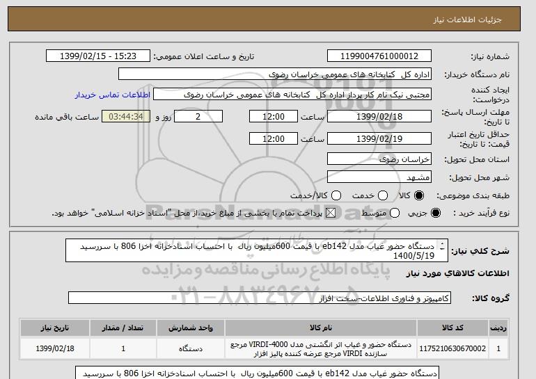 شرح کلی نیاز: دستگاه حضور غیاب مدل eb142 با قیمت 600میلیون ریال با احتساب اسنادخزانه اخزا 806 با سررسید 1400/5/19
