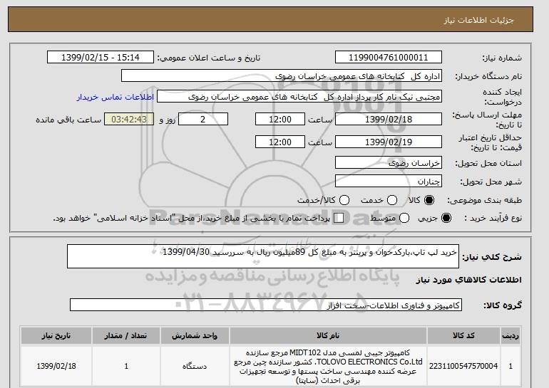 شرح کلی نیاز: خرید لپ تاپ،بارکدخوان و پرینتر به مبلغ کل 89میلیون ریال به سررسید 1399/04/30