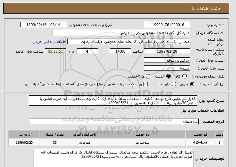 شرح کلی نیاز: تکمیل فاز نهایی طرح توسعه کتابخانه شهدای سلطان آباد(نازک کاری ونصب تجهیزات )به صورت امانی با اعتبار300میلیون ریال اسنادخزانه به سررسید1399/05/21