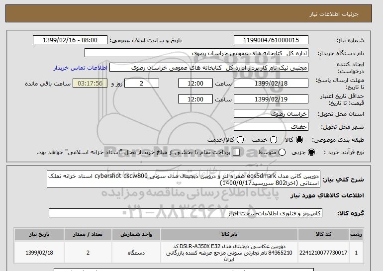 شرح کلی نیاز: دوربین کانن مدل eos5dmark همراه لنز و دروبین دیجیتال مدل سونی cybershot dscw800 اسناد خزانه تملک استانی (اخزا802 سررسید1400/0/17)